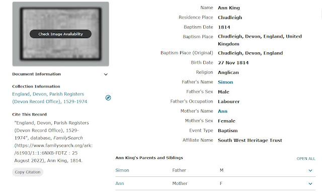 2. Ann King (May) b. 14 Nov. 1814 Chudleigh, Devon. Father Simon's occupation was listed as labourer at the time of her birth. I do not have the original image.